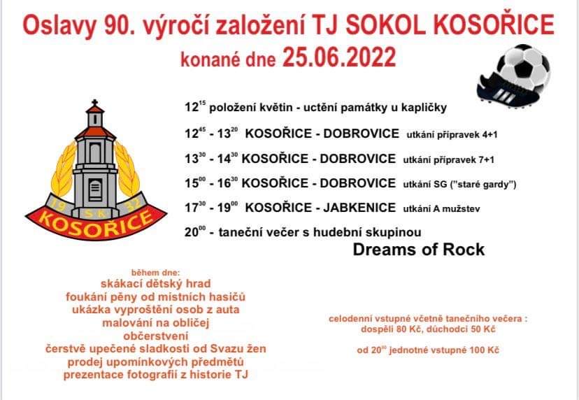 V letošním roce je tomu již 90 let, co naši předchůdci v Kosořicích založili fotbalový klub. Toto významné jubileum náš klub oslaví 25. června 2022. Připraven je program jak pro děti, tak i pro dospělé. Hlavní program obstarají zápasy všech kosořických mužstev. Podrobnosti naleznete v přílohách.